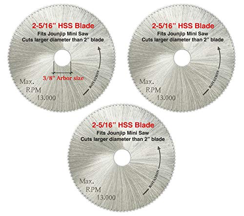 - 2 5/16" inch (58.7mm) Diameter -creates a larger cutting radius -3/8" inch Arbor -.5mm KERF(width)